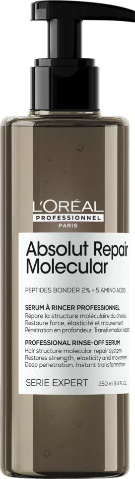 Används i det andra steget i din hudvårdsrutin där du vanligtvis applicerar din mask. Koncentrerad formula som tränger in i fibrerna och omedelbart förvandlar den inre delen av fibrerna. För optimalt resultat, använd rinse-off serum efter Absolut Repair Molecular shampoo och red ut håret så att serumet tas upp bättre. Använd i vått hår. Dela upp håret i 2 sektioner. Fördela 2–3 pumptryck serum i dina händer. Fördela jämnt i en sektion från längder till toppar. Upprepa i den andra sektionen. För mycket torrt hår, applicera från hårrötterna ända ut i topparna. Arbeta in serumet i håret mellan handflatorna i 1 till 2 minuter. Ingen verkningstid behövs. Skölj ur ordentligt. För ett optimalt resultat, avsluta med Absolut Repair Molecular leave-in mask.