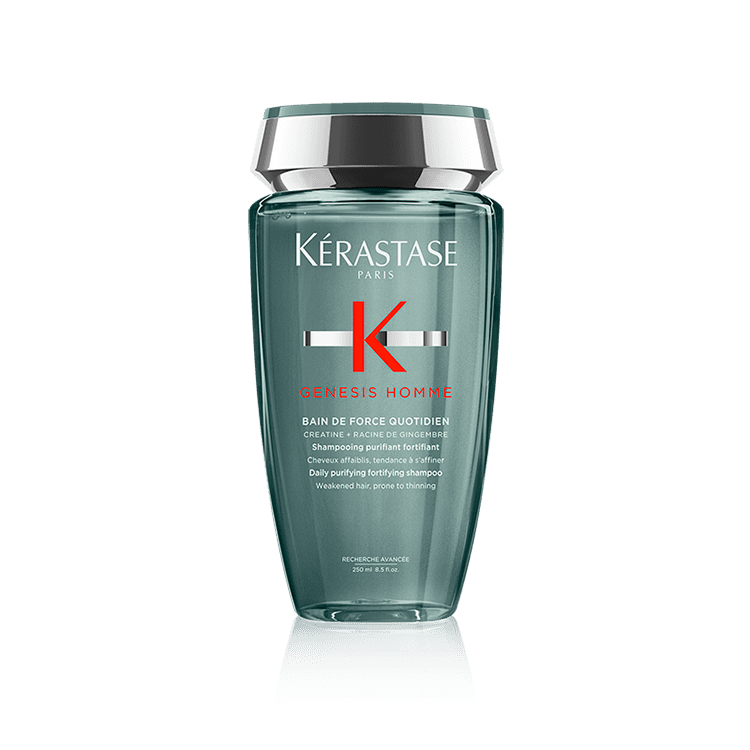 Genesis Homme Bain de force Quotidien från Kerastase är ett dagligt rengörande, stärkande schampo för män med försvagat hår med tendens att tunnas ut.