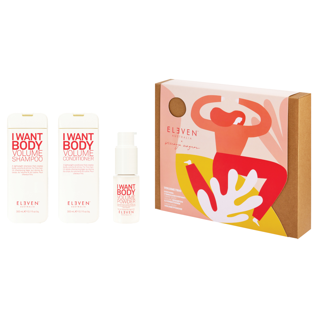 En trio i begränsad upplaga från ELEVEN Hair inklusive tre volymbetonande hårprodukter. Detta exklusiva julklappsset innehåller ELEVEN I Want Body Volume schampo och balsam, samt ELEVEN I Want Body Volume Powder.