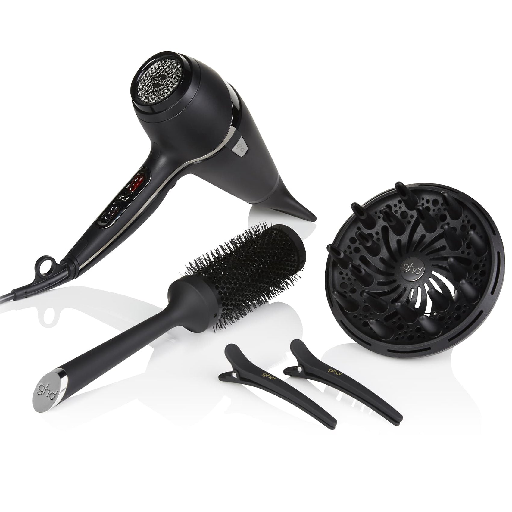 Säg farväl till platt och frissigt hår med vårt splitternya ghd air® hair drying kit. Som innehåller den prisbelönta ghd air® professional-hårfönen med en motor lika stark som på salong, för supersnabb föning, samt joniseringsteknologi, vilket ger dig en snygg salongsfrisyr på halva tiden*; ett ghd air®-volymmunstycke värt 249 kr för att bättra på dina naturliga lockar och din volym; ett precisionsmunstycke för detaljerad styling; två klämmor för att dela in håret i sektioner för enklare styling; rundborsten ghd vented radial brush i storlek 3 till ett värde av 349 kr. för att ge lyft och textur till din blow dry OCH skyddsfodralet ghd air® soft protection cover till ett värde av 59 kr för bättre förvaring så att allt har en säker plats. Allt du behöver för en ultimat blow dry.