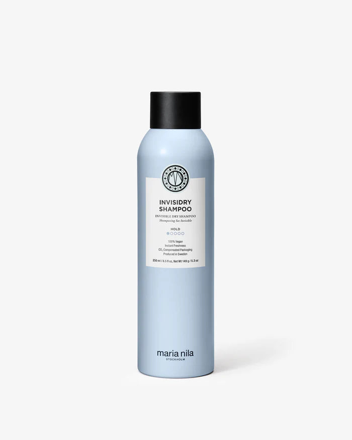 Ett lätt torrschampo i sprayform som snabbt fräschar upp smutsigt hår och hårbotten mellan tvättar. Produkten absorberar upp fett från hår och hårbotten och ger en känsla av nytvättat hår. Till skillnad från Maria Nila Dry Shampoo, så ger Invisidry Shampoo lättare stadga och lämnar ingen synlig produkt i håret tack vare sin innovativa formula. Den passar därför perfekt till både blont och mörkt hår. Invisidry har en fruktig doft av passionsfrukt och äpple.