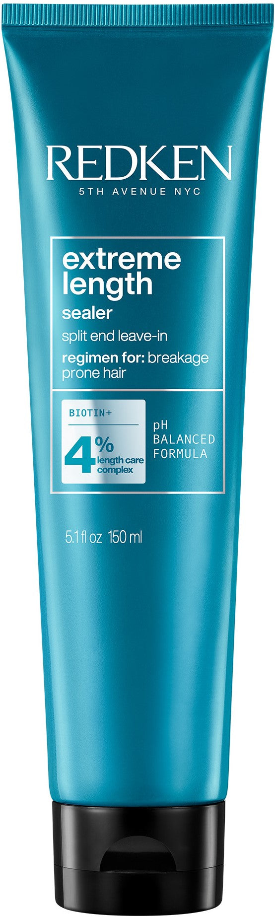 Extreme Length leave in-behandling, vars formula innehåller sojaprotein och biotin, hjälper till att försegla och stärka toppar, samt minska synligheten av kluvna toppar.