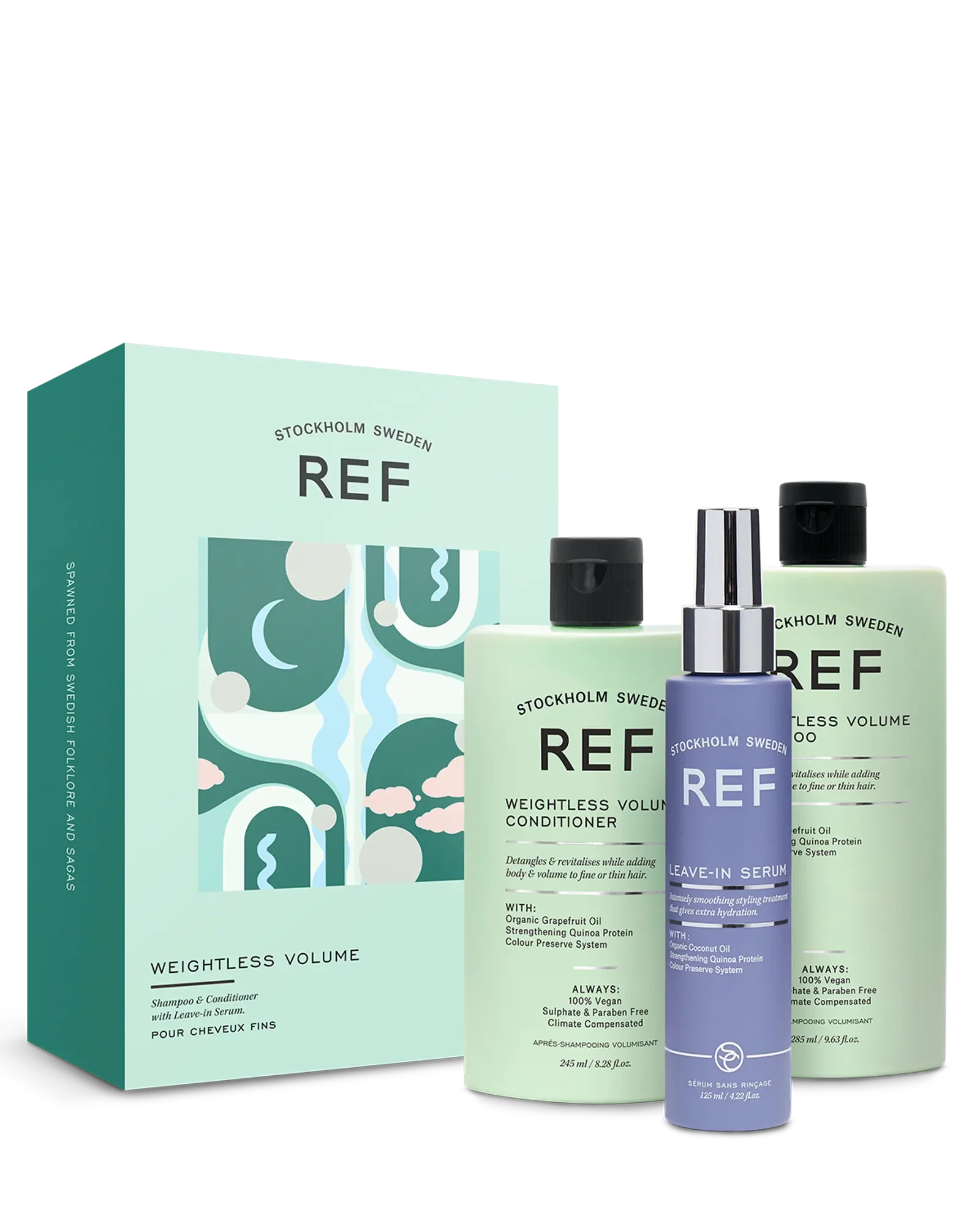 Ge fint hår lyft med Nordic Myth Weightless Volume Gift Box – med REF Weightless Volume Shampoo, REF Weightless Volume Conditioner och Leave In Serum. Kitet ger volym, fyllighet och luftig glans utan att tynga. Schampot rengör fräscht och bygger fyllighet, balsamet återfuktar och stärker med quinoaprotein medan ekologisk grapefruktolja piggar upp hårbotten, och leave-in-serumet minskar frizz, förseglar toppar och ger glansig finish. Innehåller; Weightless Volume Shampoo 285 ml, Weightless Volume Conditioner 245 ml,