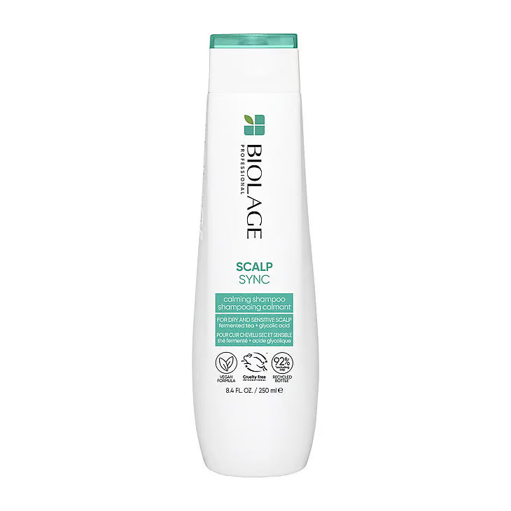 Lugna och återfukta din torra, känsliga hårbotten med Biolage Scalp Sync Calming Shampoo. Denna formula är berikad med fermenterat te och glykolsyra för att effektivt rengöra samt lugna hårbotten och förhindra torrhet i framtiden.