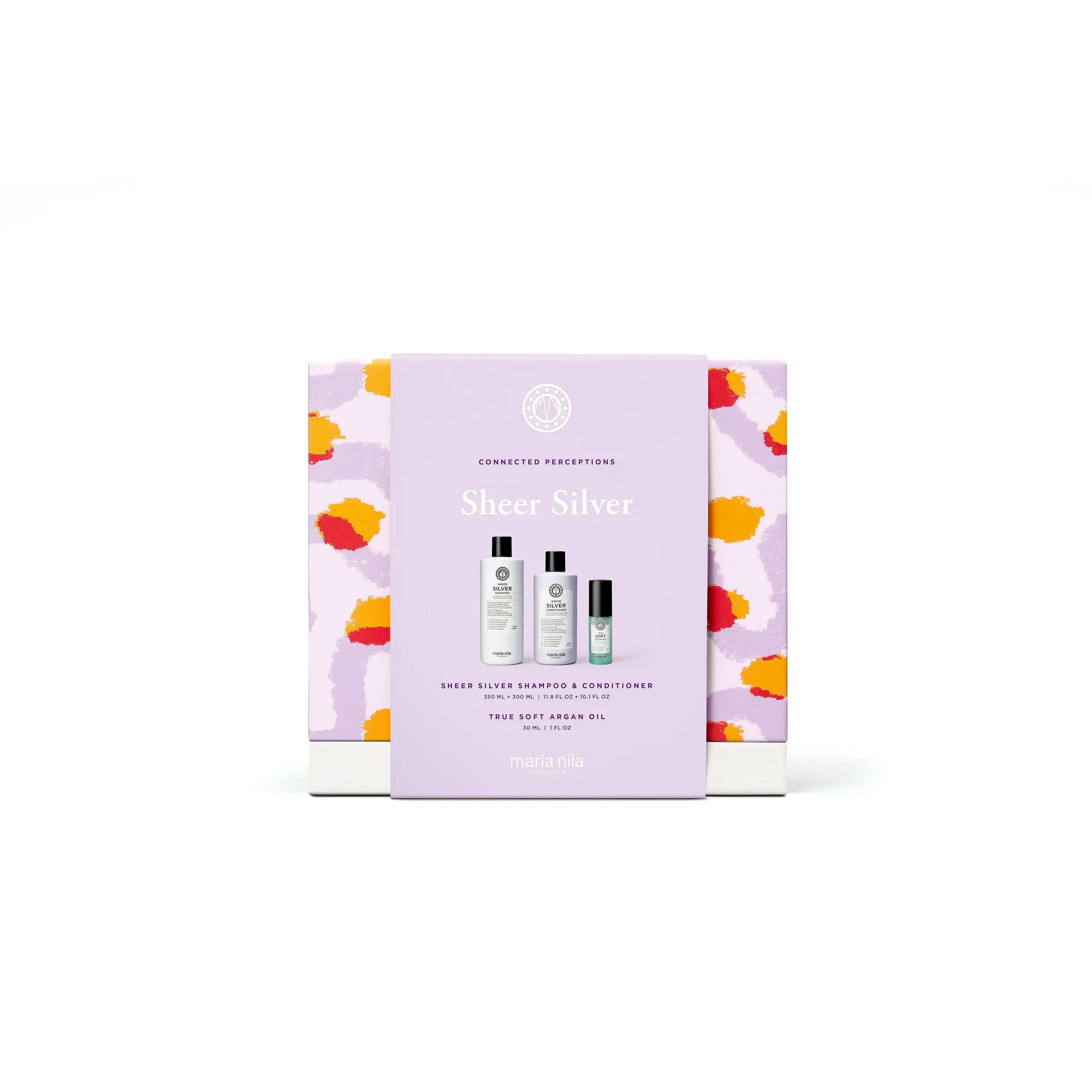 Sheer Silver Gift Box bidrar till att neutralisera guldiga toner och tillför glans som framhäver din hårfärg. Gift Boxen innehåller schampo och balsam i fullstorlek från Sheer Silver-serien och en True Soft Argan Oil 30 ml, som en gåva från oss. Sheer Silver har en doft av jasmin, viol och citrus.